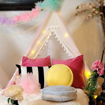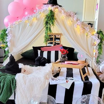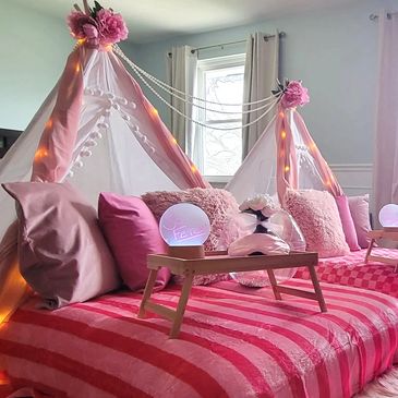 Indulge in the ultimate sleepover experience with our signature all-inclusive setup—designed for those who want the very best. We bring everything you need for a stylish, stress-free celebration, including tents, mattresses, premium décor, plush throw rugs, and keepsake sleep masks. Just sit back, relax, and let the magic unfold.
