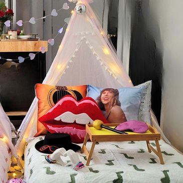 Step into your own Eras Tour wonderland with Tents & Taylor —a dreamy Swiftie sleepover packed with glowing tents, cozy music note blankets, disco balls, and glam touches from every Taylor era. With mini mics, sparkly props, and all the sing-along vibes, it’s perfect for bestie nights or full-on Swiftie celebrations.
