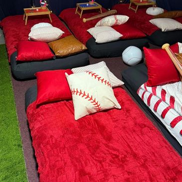 Bring the ballpark home with this sporty sleepover setup. Featuring a turf grass rug, baseball-inspired pillows, fun inflatables, and a bold red and white color palette, this theme is perfect for sports fans who want to celebrate in style — no cleats required.