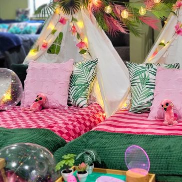 Bring the tropics to your Michigan home with our Tropical Slumber Party theme! Bursting with bright pinks and lush greens, flamingo accents, and festive tropical greenery, this setup creates a fun and vibrant island vibe perfect for cozy sleepovers with your besties.