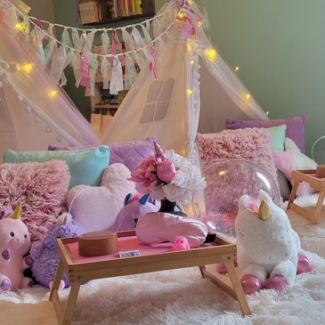 A magical mini world filled with sparkly lights, fluffy pillows, pastel plushies, and the cutest unicorn friends! Perfect for giggles, cuddles, and make-believe adventures under twinkling lights. Let the unicorn magic begin!